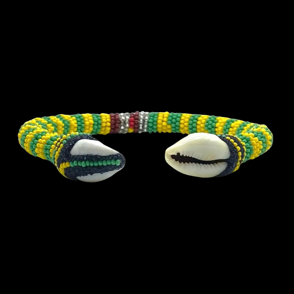 Handmade Lukumí Orula bracelet honoring Agayú. Green, yellow, white, red, and earthy tones with cowrie shells