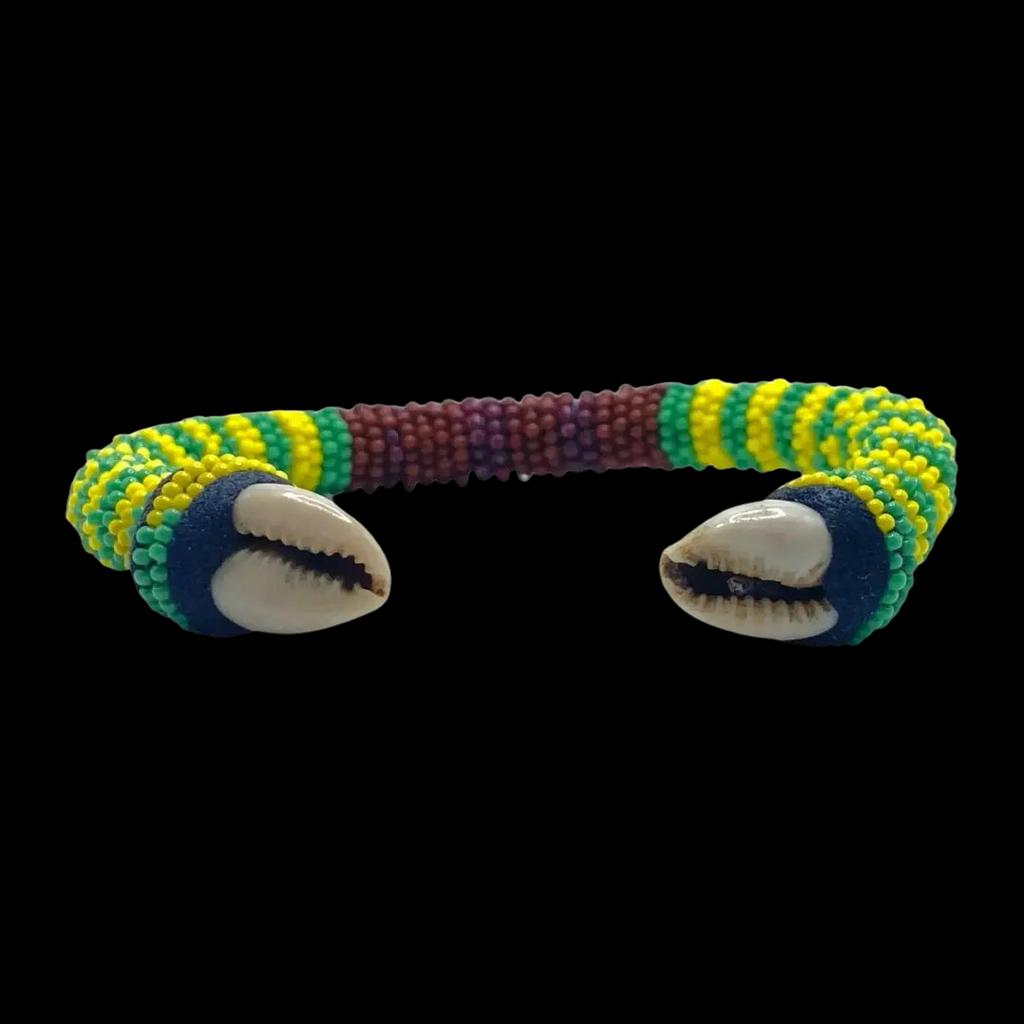 Cowrie shells at both ends channel protection, transformation, and wisdom.